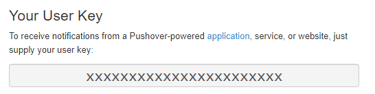 At your Pushover dashboard you can view your userKey in the top right.